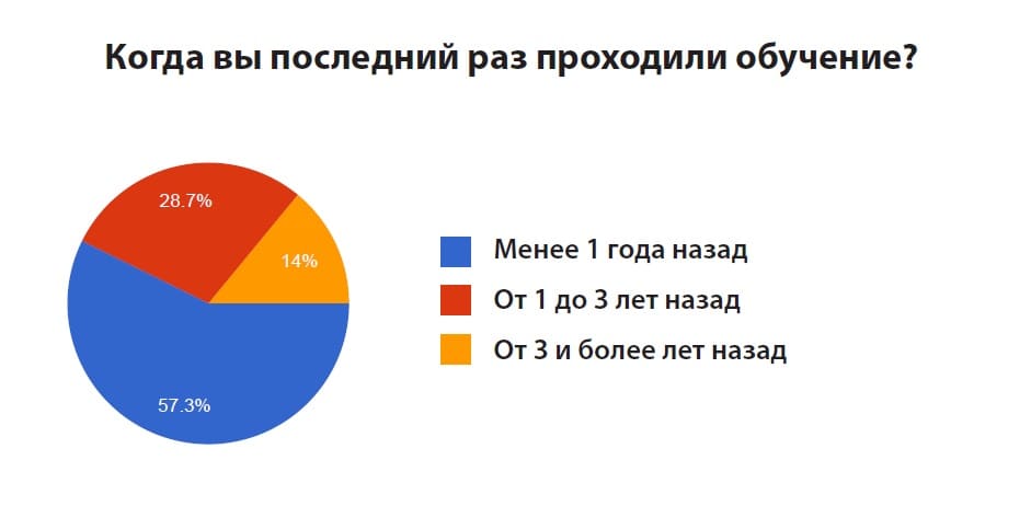 В опросе приняли участие 500 человек, заинтересованных в обучении: топ-менеджеры, менеджеры среднего звена и линейные специалисты со всей России. Исследование проводилось среди представителей компаний из разных сфер бизнеса и с различной численностью персонала. Большинство участников опроса регулярно проходят обучение: 51,9 % опрошенных учатся минимум 1 раз в год и 28,7 % — 1 раз в 3 года.