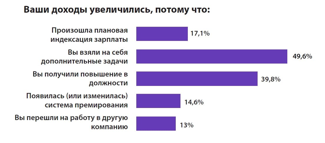 Среди главных причин увеличения дохода участники обучения выделяют выполнение дополнительных задач и ведение новых проектов (49,6%) и повышение в должности (39,8%).